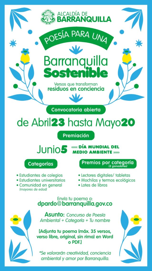 Como parte de la estrategia Barranquilla Limpia y Linda, el Distrito lanza oficialmente el concurso ‘Poesía para una Barranquilla Sostenible’, una convocatoria que invita a la ciudadanía a expresarse a través del verso sobre el amor por la ciudad, el respeto por sus espacios públicos y la conciencia ambiental.