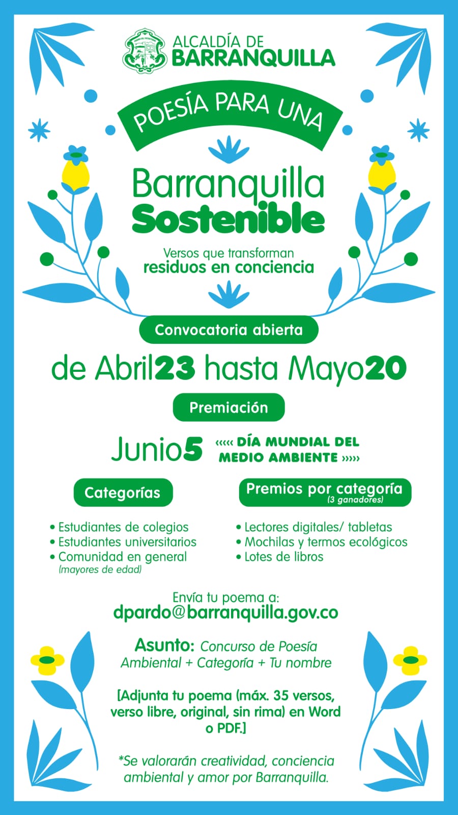 Los poemas deben enviarse al correo dpardo@barranquilla.gov.co, con el asunto: Concurso de Poesía Ambiental + Categoría + Nombre del participante.
