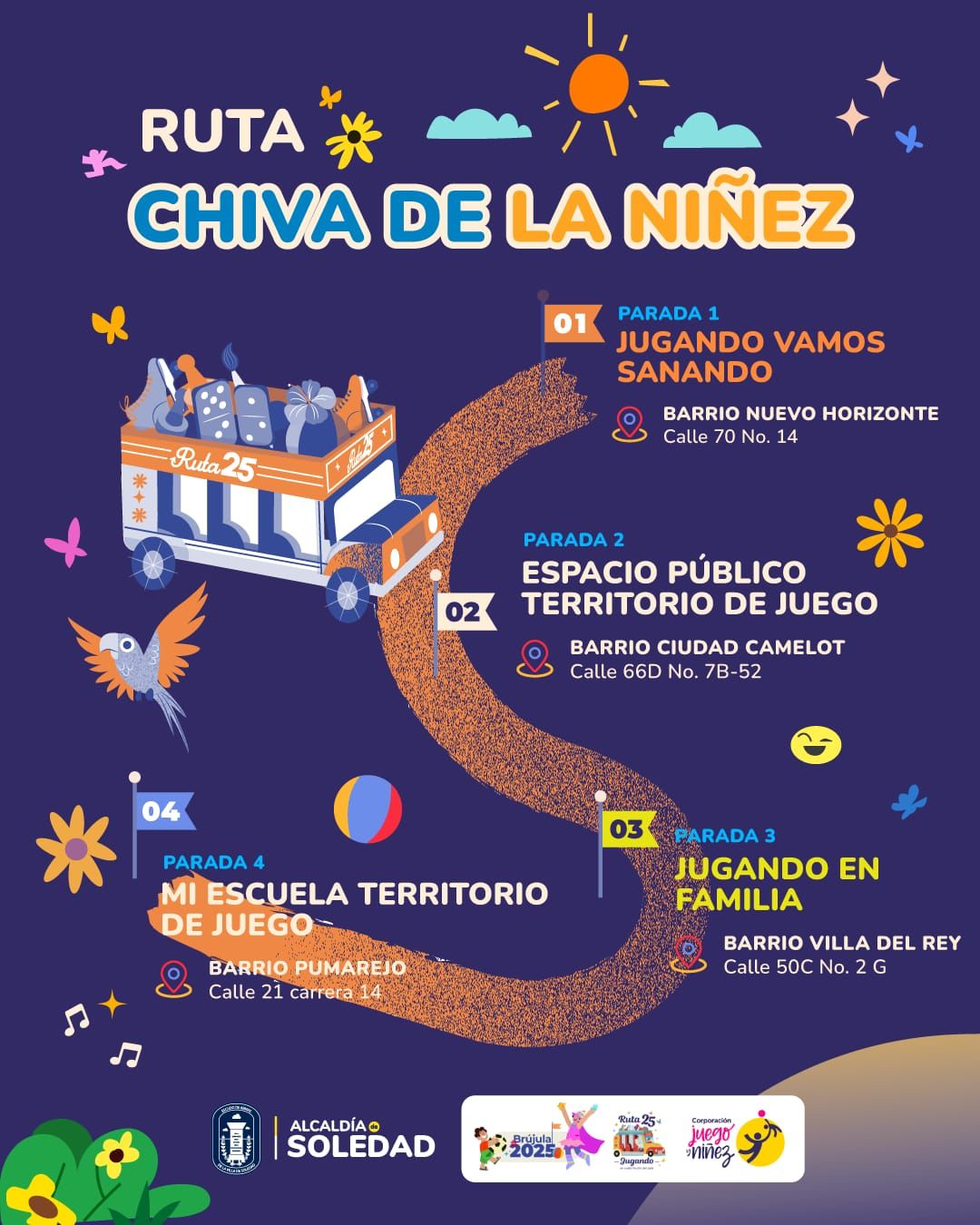 La Alcaldía de Soledad, conmemora el Día de la Niñez, enmarcado en la estrategia del Gobierno Nacional Brújula 2025, “Carnavales del Juegos por la niñez en toda Colombia”, que en esta oportunidad tiene como objetivo vivenciar el derecho al juego en armonía con los demás derechos, impactando significativamente y de manera intencional y real a las niñas, los niños, los adolescentes y sus familias, brindando a los territorios espacios que refuercen los derechos de la niñez y la vivencia del juego, como experiencia fundamental en el desarrollo integral de los menores.