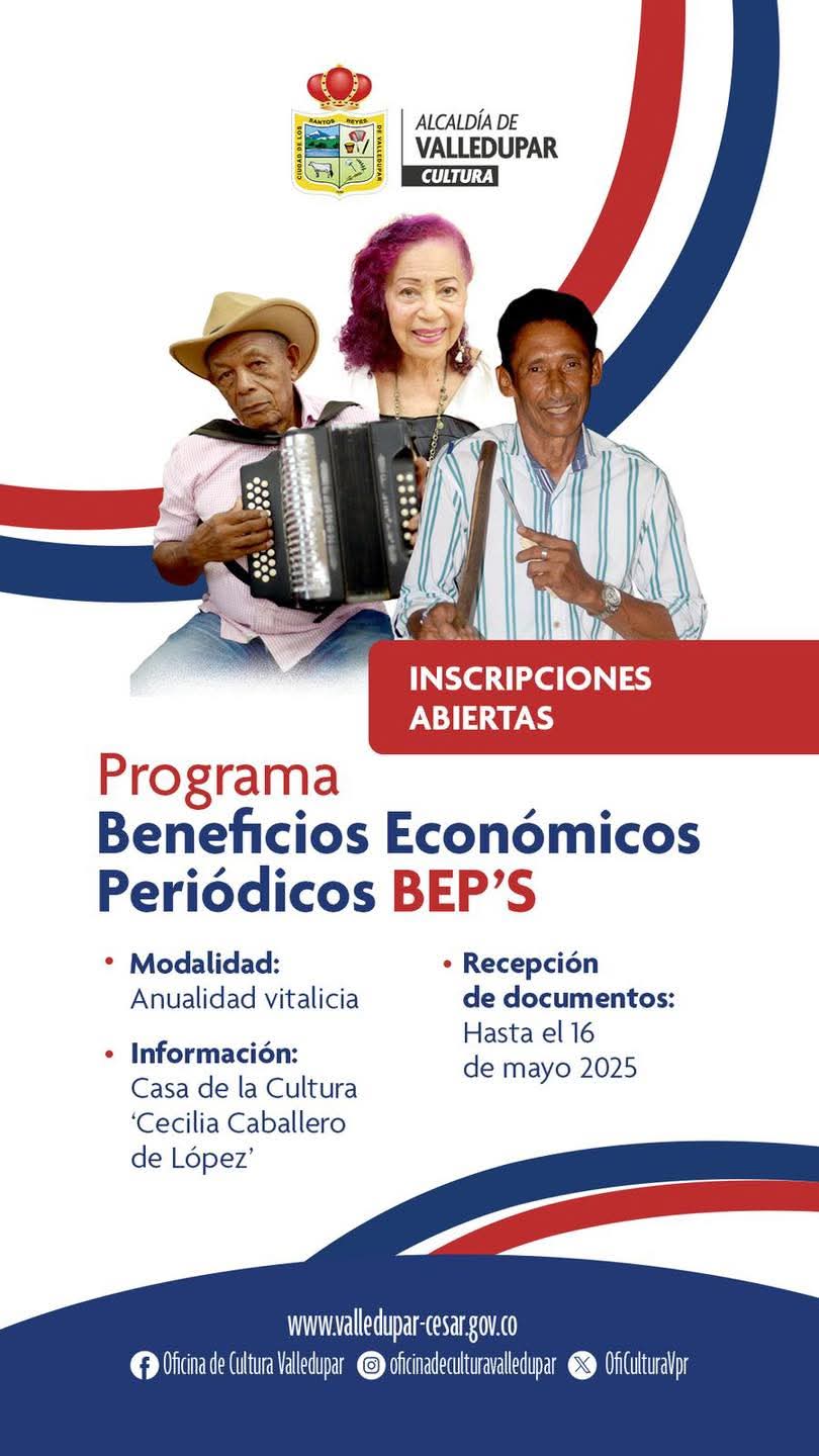 La Alcaldía de Valledupar, en articulación con el Ministerio de las Culturas, las Artes y los Saberes, ha anunciado la apertura de inscripciones para que los gestores culturales de la tercera edad puedan postularse al programa de Beneficios Económicos Periódicos (BEP’s), en su modalidad de anualidad vitalicia.