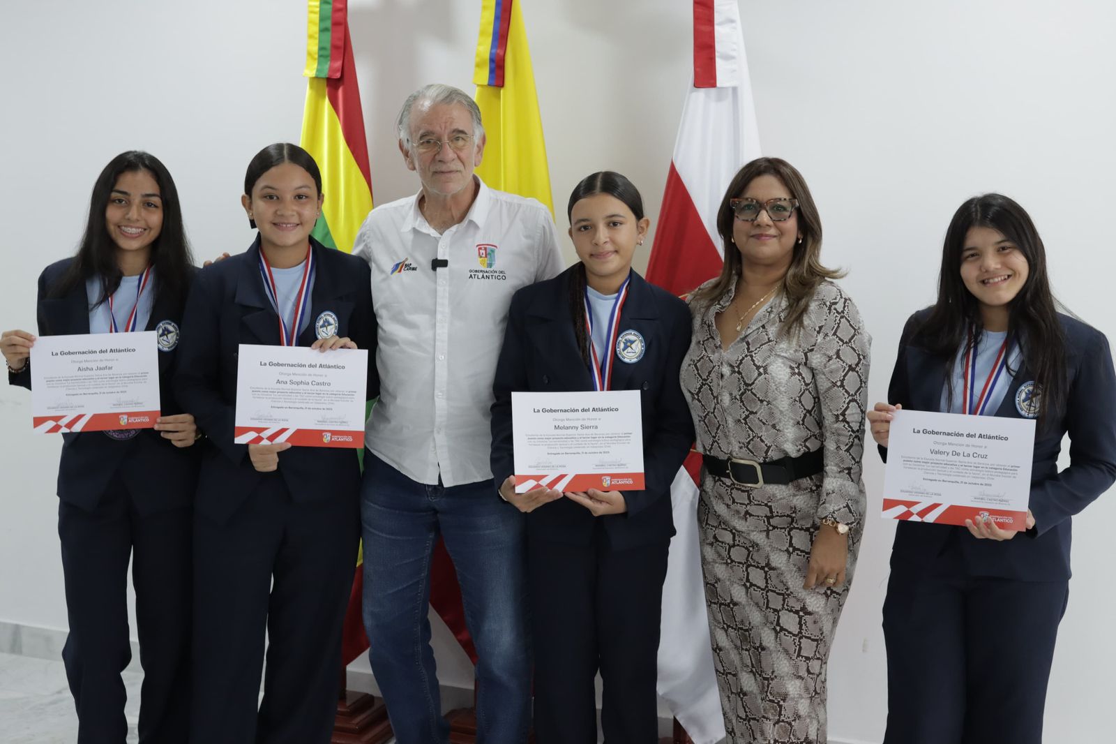 En un acto realizado en la Sala de Juntas de la Gobernación del Atlántico, el mandatario recibió a la rectora, docentes y estudiantes del semillero de investigación que representó al departamento, entregándoles una Mención de Honor por su valioso aporte a la innovación educativa y al desarrollo sostenible.