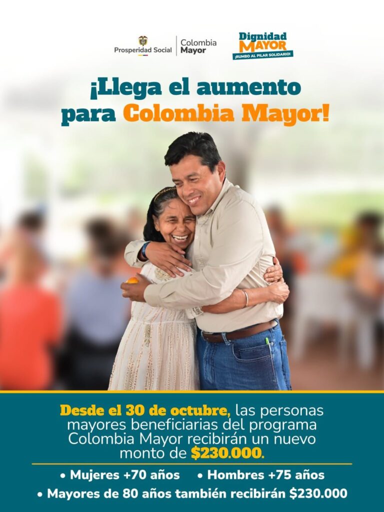 La Alcaldía de Soledad, a través de la Secretaría de Gestión Social, socializa a la comunidad que a partir del 30 de Octubre se da inicio a los pagos del Ciclo 10 del programa Colombia Mayor, en donde 10.163 adultos mayores entre 70 y 75 años, mujeres y hombres respectivamente, recibirán un incremento del 187,5% en su subsidio, pasando de $80.000 a $230.000 mensuales, un aumento que dignifica la vida y garantiza una cobertura adecuada para cubrir sus necesidades básicas.