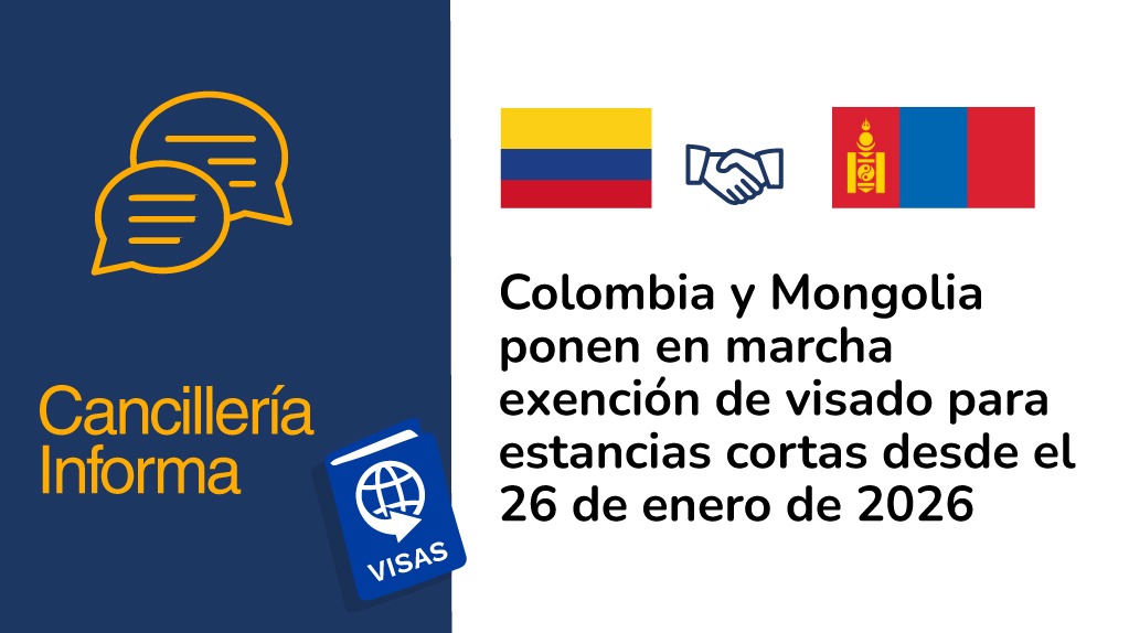 A partir de hoy entra en vigor el Acuerdo entre el Gobierno de la República de Colombia y el Gobierno de Mongolia sobre la Exención de Visado de Corta Estadía para Titulares de Pasaportes Ordinarios, tras la culminación de los procedimientos internos de formalización en ambos países. El instrumento fue firmado en diciembre de 2024.