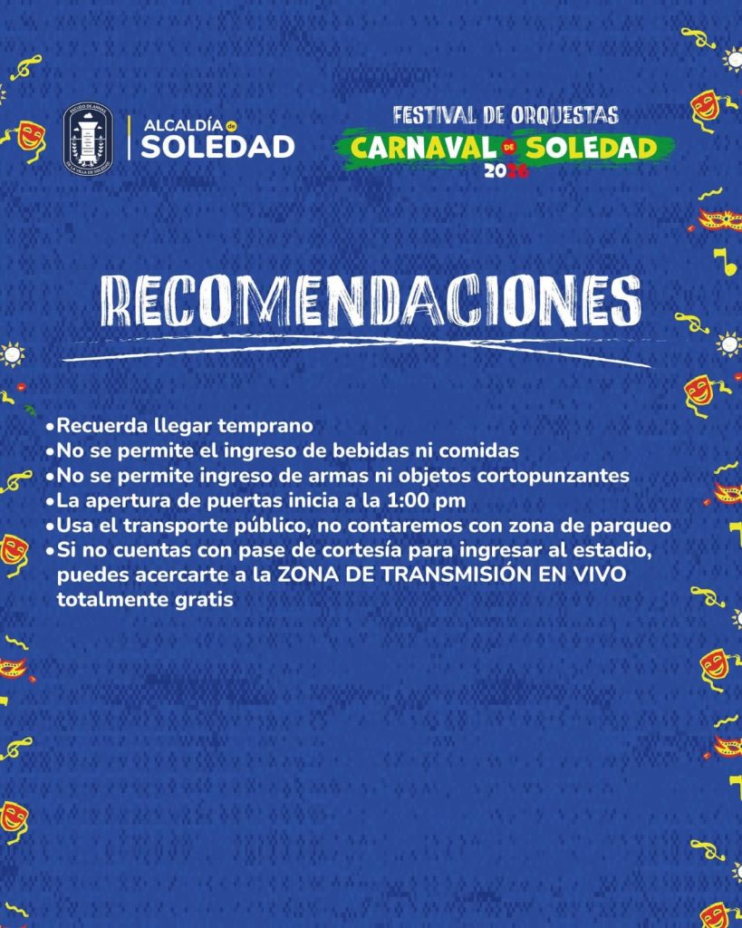 La Alcaldía de Soledad se permite informar a la opinión pública que no se encuentran a la venta, bajo ningún concepto, las boletas de entrada al Festival de Orquestas, evento que se realizará este domingo 15 de febrero en el Estadio del Hipódromo.