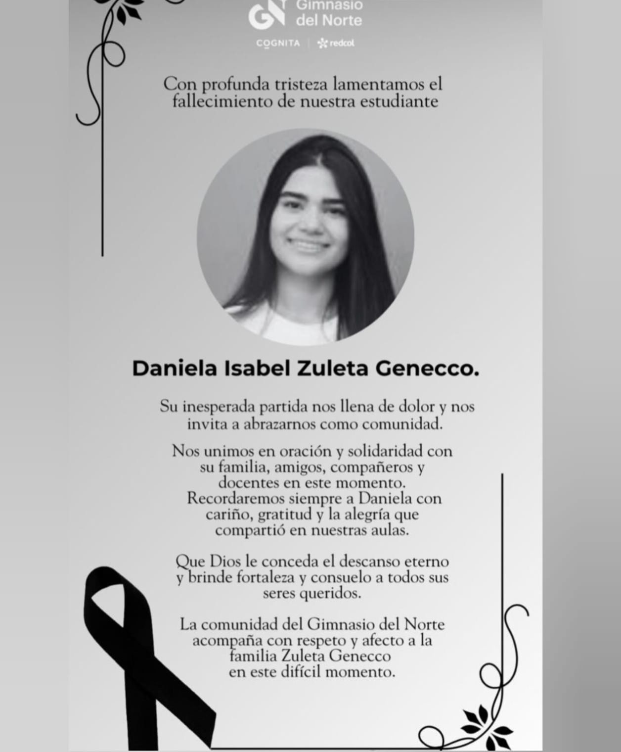 La comunidad educativa del Gimnasio del Norte, donde Daniela cursaba sus estudios, lamentó profundamente la pérdida a través de un emotivo comunicado:»Con profunda tristeza lamentamos el fallecimiento de nuestra estudiante Daniela Isabel Zuleta Genecco.