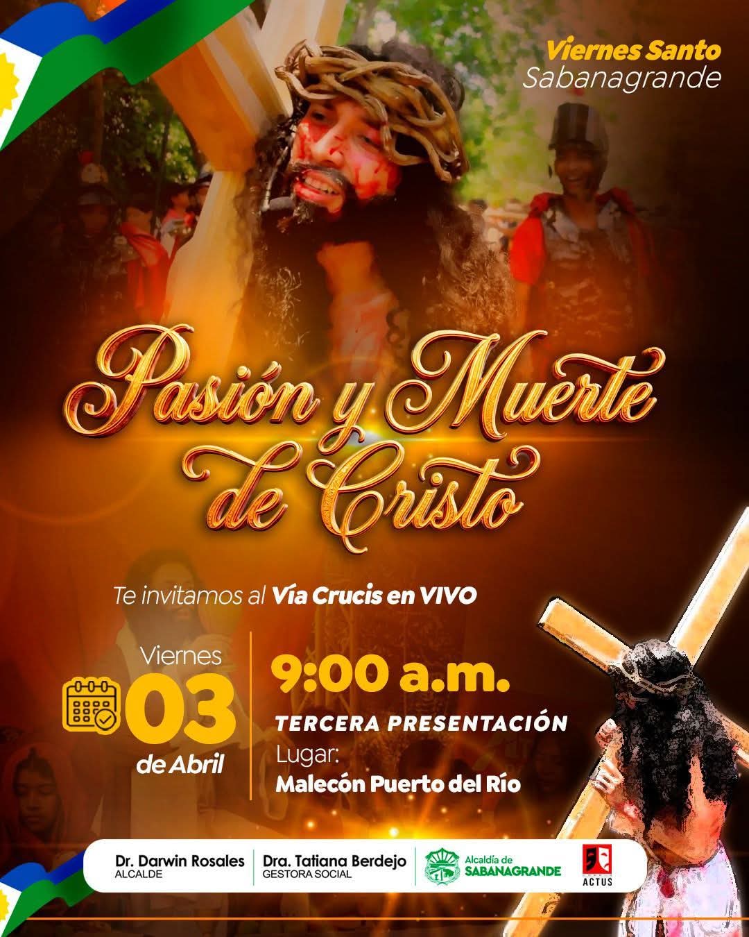 La Alcaldía de Sabanagrande invita a toda la comunidad a vivir una de las tradiciones más representativas de la Semana Santa con la dramatización de la Pasión y Muerte de Jesucristo, a cargo del grupo ACTUS en su trigésima tercera versión.