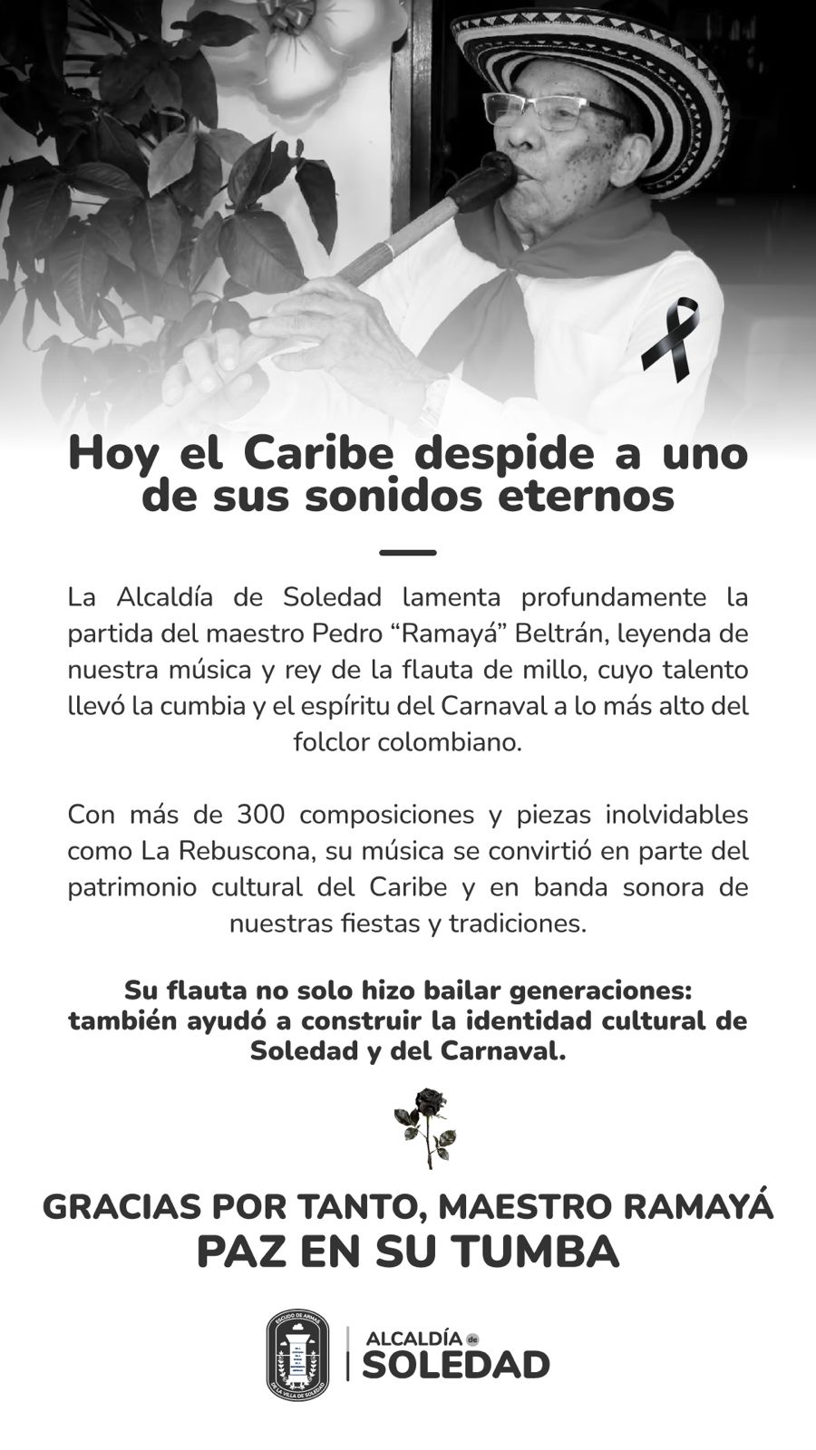 La Alcaldía de Soledad, mediante el Decreto N.º 00039 del 11 de abril de 2026, honra la memoria del maestro Pedro Agustín Beltrán Castro, conocido artísticamente como Pedro “Ramayá” Beltrán, y exalta su invaluable legado artístico y cultural en la historia del folclor del Caribe colombiano.